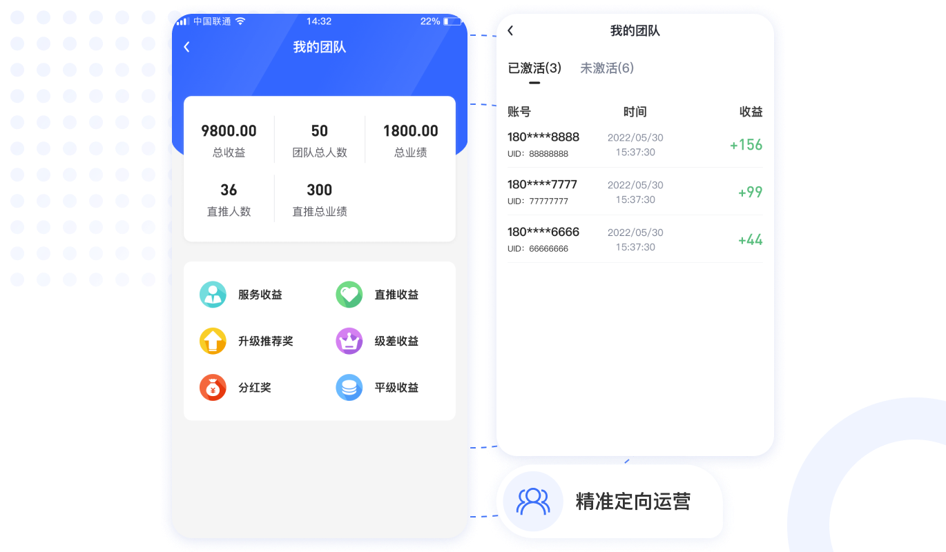用戶激活收益,團(tuán)隊(duì)推薦獎(jiǎng),團(tuán)隊(duì)極差收益,快速裂變用戶