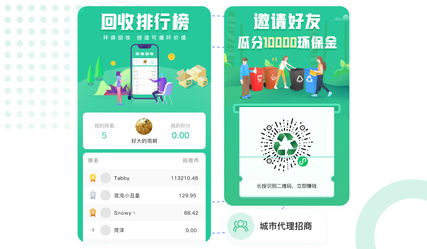 用戶出售垃圾廢品換錢的同時(shí)享受積分,積分可以兌換商品,增加用戶的使用黏性。